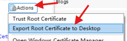 配置好后,点击HTTPS选项卡里面的Actions,选择第二个”Export Root Certificate to Desktop”导出证书