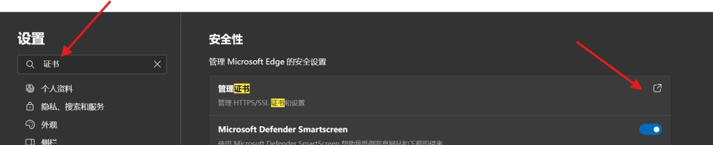 点击确定,然后打开浏览器的设置选项,在搜索框里面输入”证书”然后搜索,点击管理证书