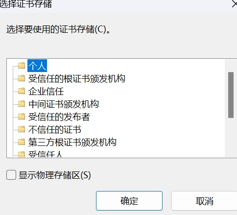 在弹出的对话框中选择第二个”受信任的根证书颁发机构”,然后点击确定