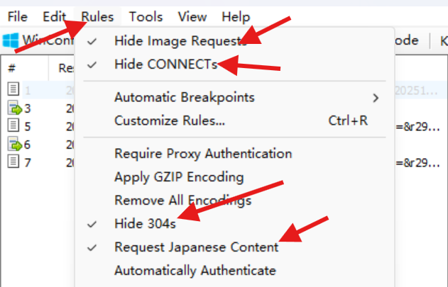 点击菜单栏的Rules,然后依次勾选这四个即可,第四个”Request Japanese Content”勾选后再次打开Fiddler就取消勾选了,重新勾一下就好