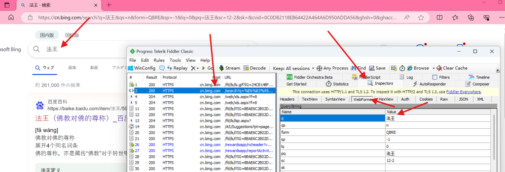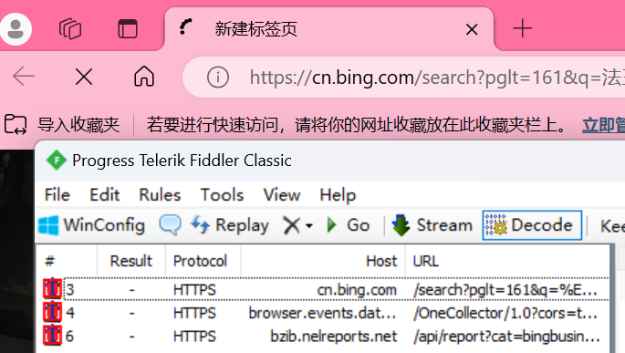 运行Fiddler后就开启抓包了,在浏览器搜索内容就可以在Fiddler看见对应的包