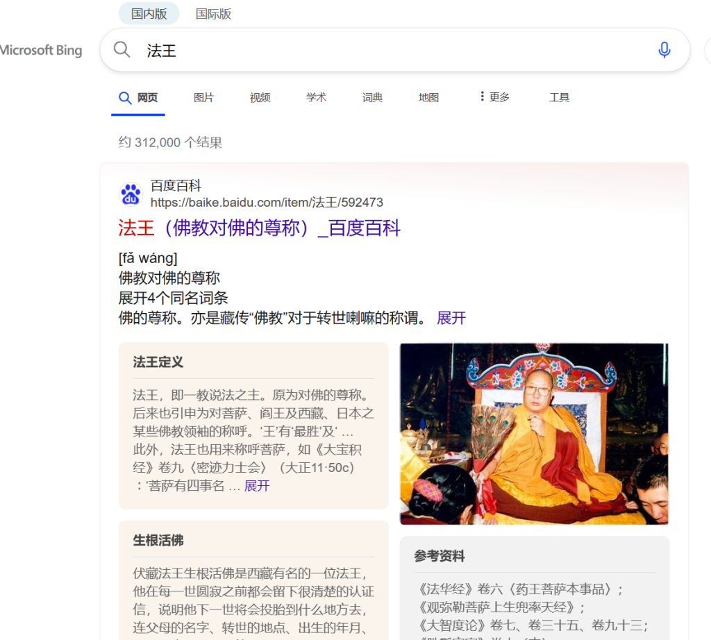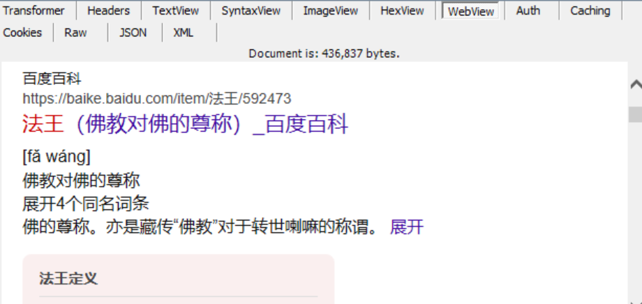 比如图片或者网页,就打上面那个例子来讲,我搜索法王后,页面显示了这些内容,这些就是服务器返回的内容,返回值就是数据,比如这个”法王定义”参考资料”等等,这些内容都是服务器返回给我们的值,其中会夹杂一些图片的数据