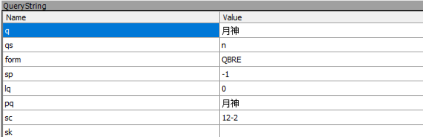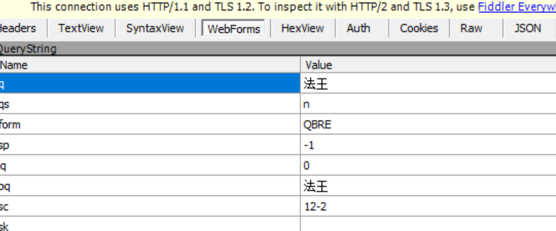 在请求网页或者刷新网页后,双击点开对应的包就可以看到请求的参数,这里还是搜索”法王”,可以看到我们请求的数据包里面就有这个参数,如果我们请求的内容是”月神”,那么这个q对应的值就是”月神”,Name指的是参数的名称,Value指的是这个参数对应的值